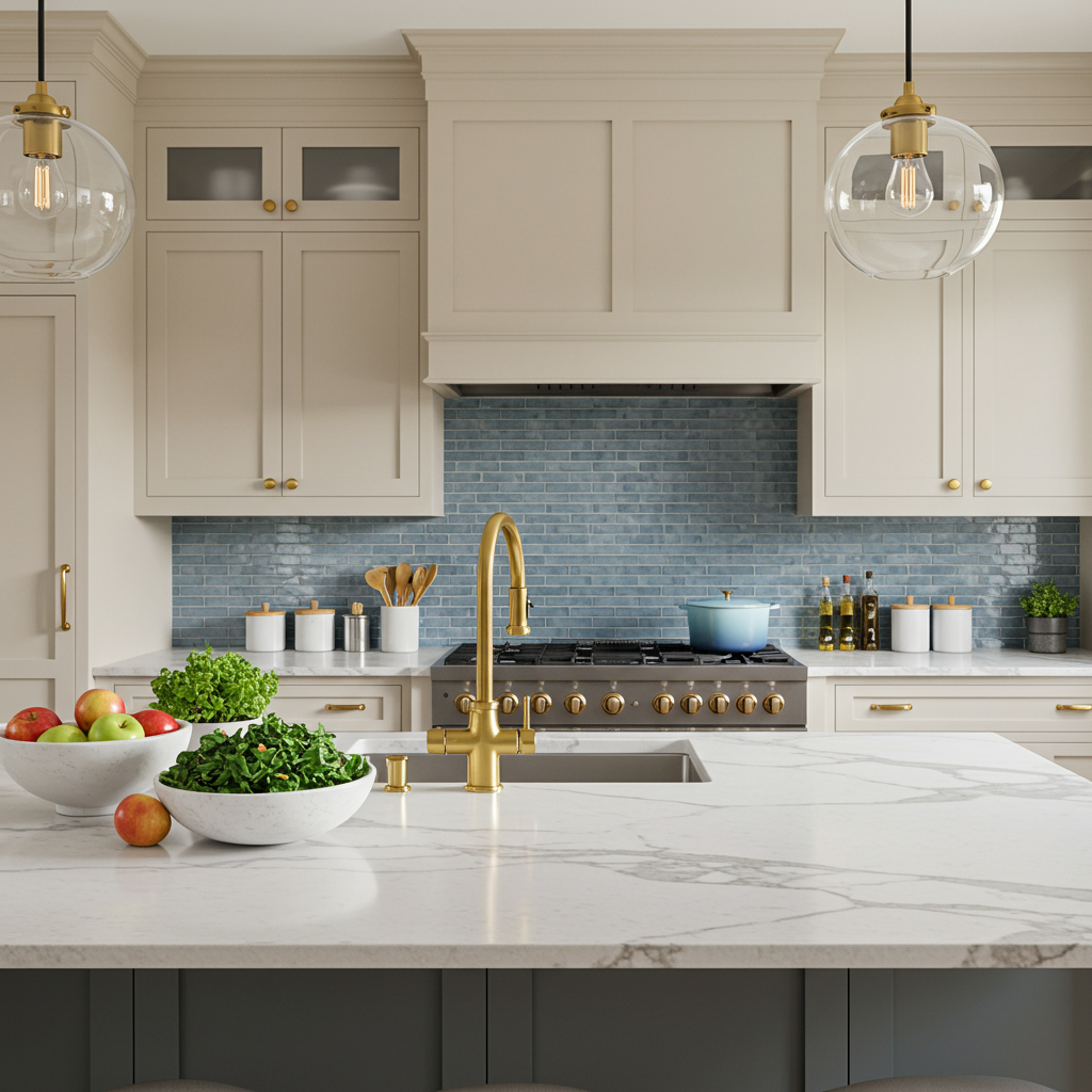 Beautiful blue cabinetry provides tons of storage in this open kitchen with stunning water views. A lighter aqua-colored island gives family and friends a spot to gather around in this delightful space with layers of blues...