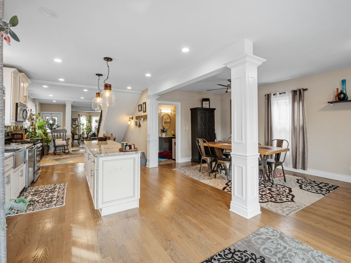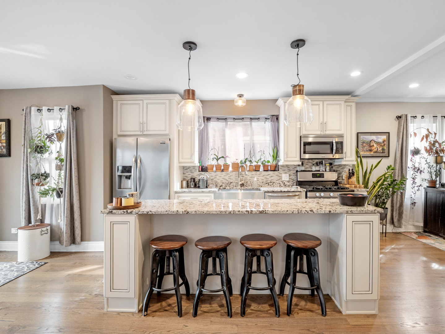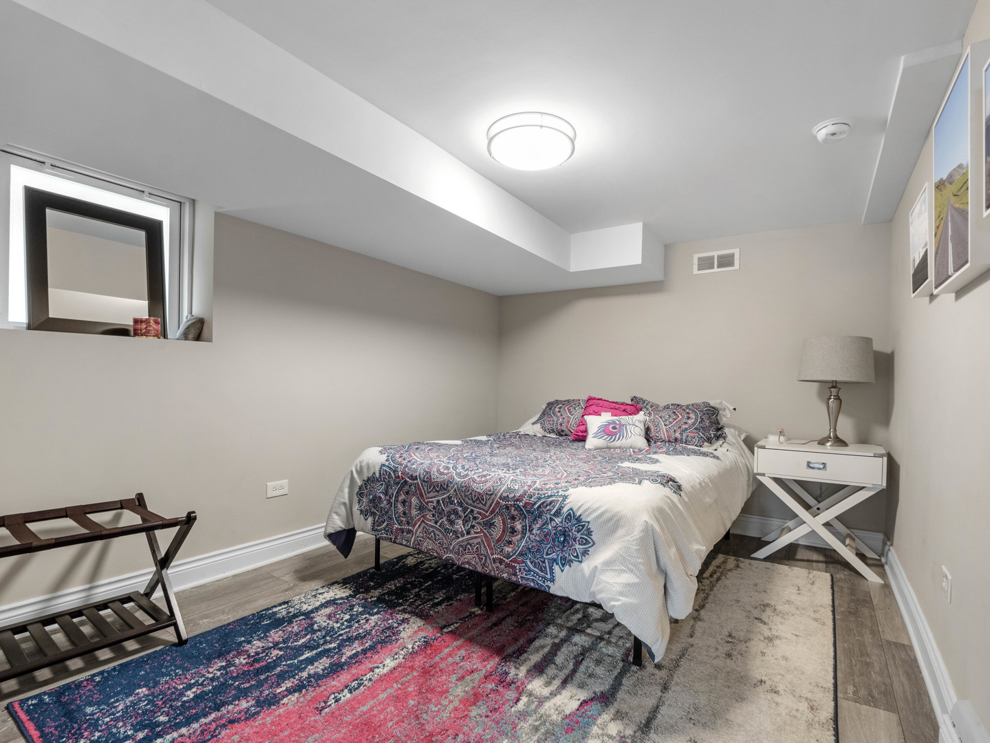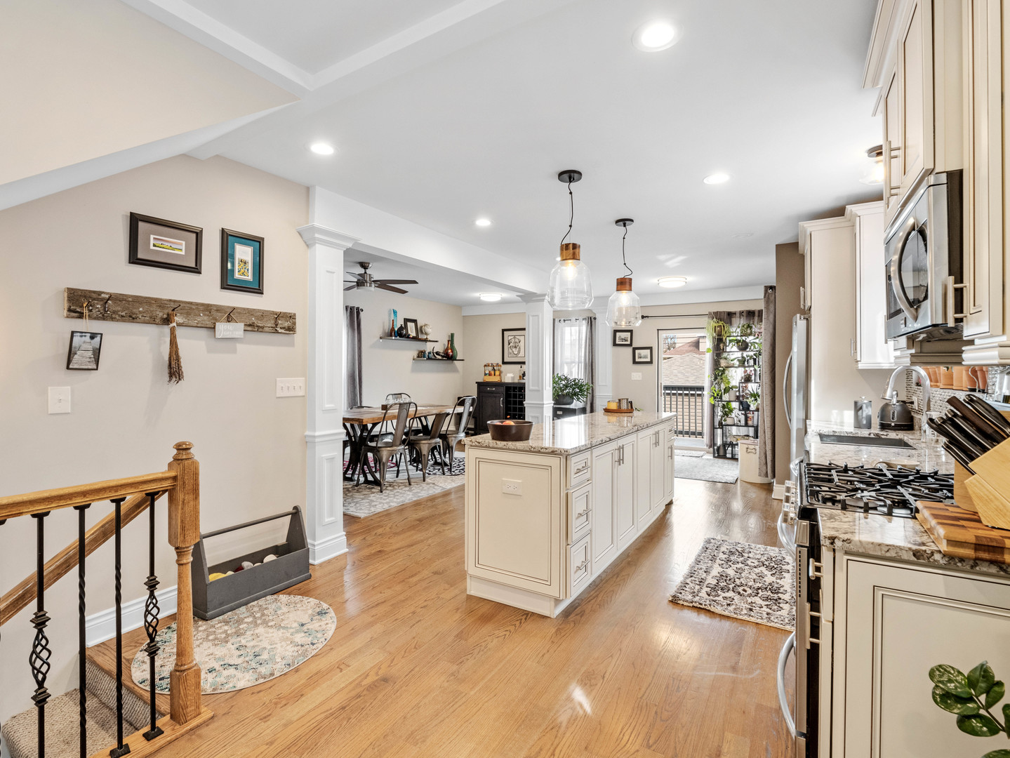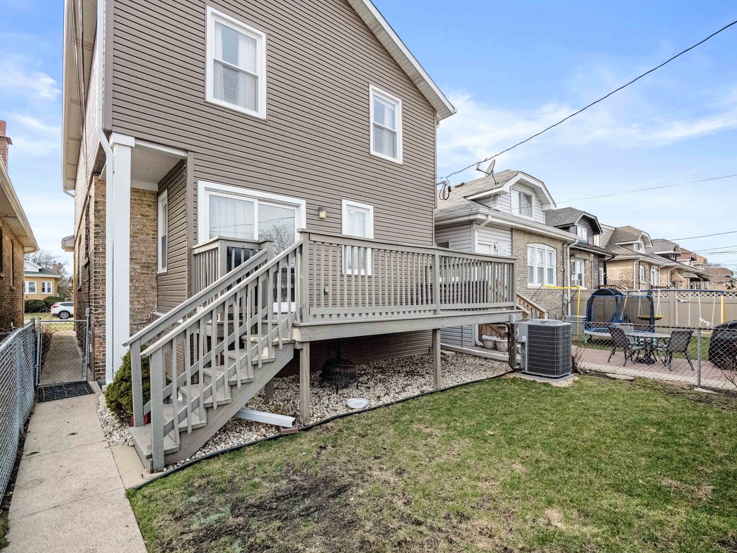 Fully renovated in 2017, this 5-bedroom, 3-bath brick bungalow with a complete 2nd-story addition offers modern living at its finest. This home features a custom kitchen with designer cabinets, newer stainless steel appliances, a granite island, and a glass tile backsplash, all overlooking a serene backyard and deck. Hardwood floors are found throughout the living, dining, and main-floor bedroom, which connects to a whirlpool bath. On the second floor, an expansive primary suite includes a skylight and a large walk-in closet. Two additional extra large bedrooms and a bathroom with double sinks complete this level. The fully finished basement offers a family room, additional bedroom, and ample storage and laundry space with new vinyl plank flooring. Step out back to enjoy a private deck and yard-perfect for entertaining. Just a 15 minute walk from the Metra stop, this well-rounded abode is calling your name. Recent updates include Furnace/AC 2024, New Gutters and Blown in Attic Insulation 2024.