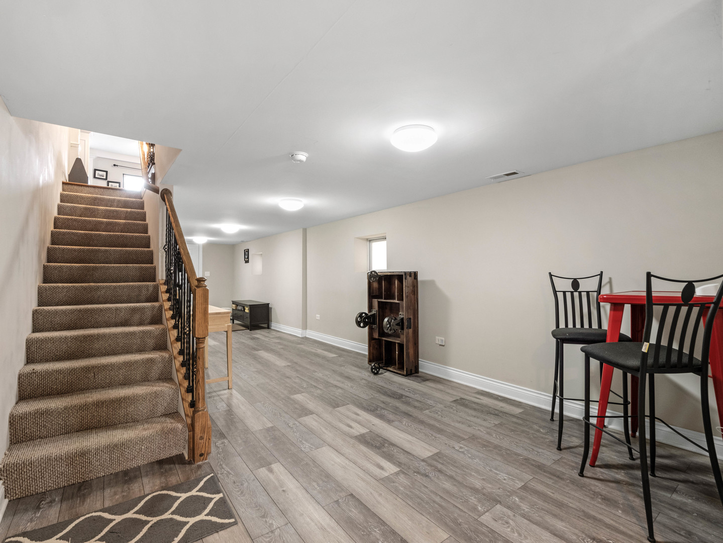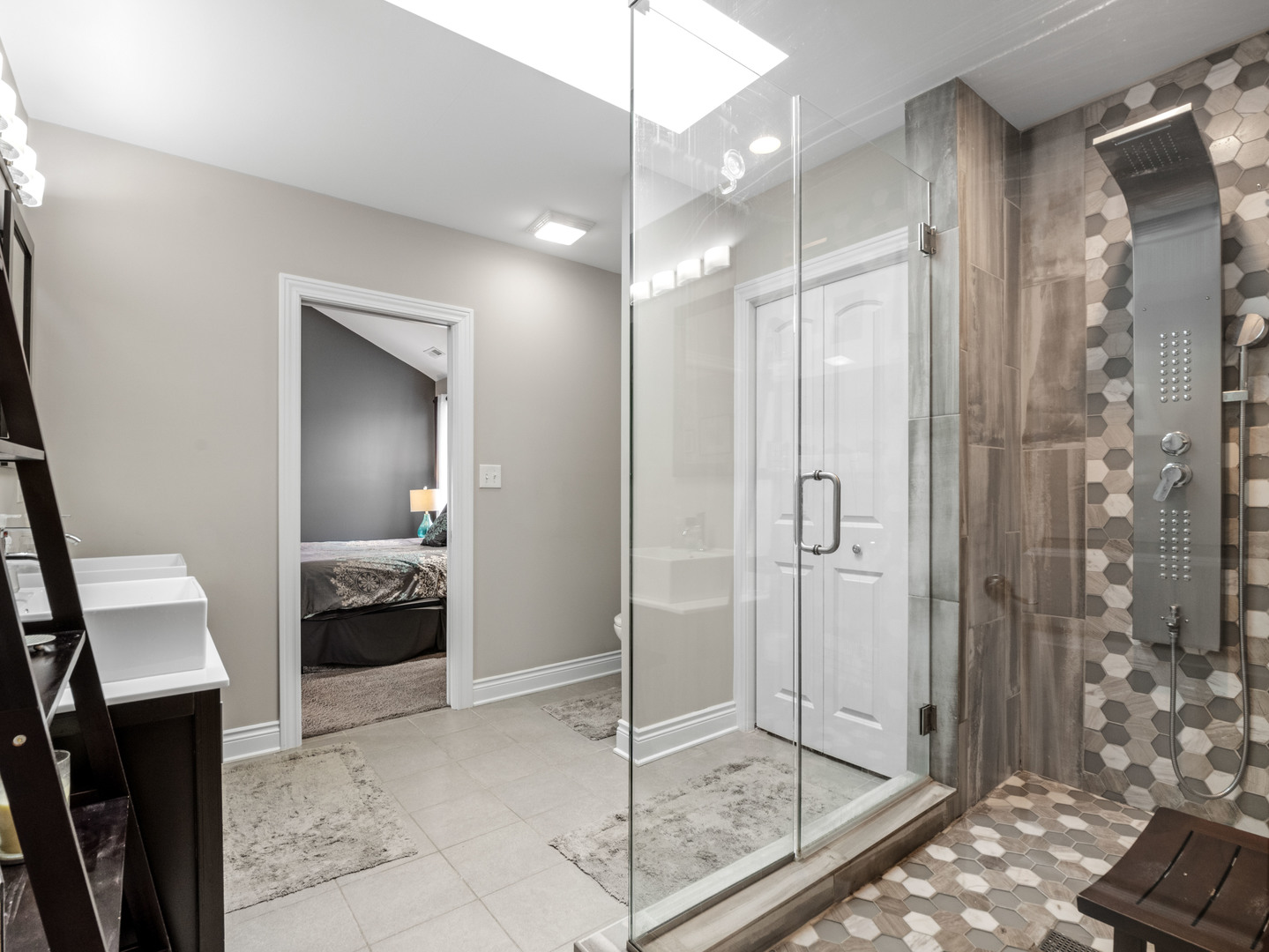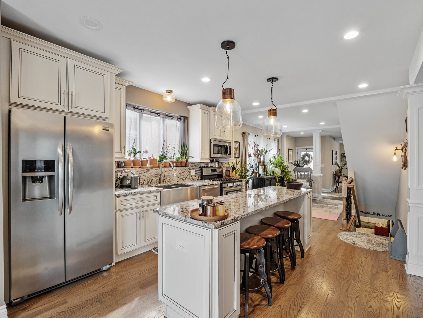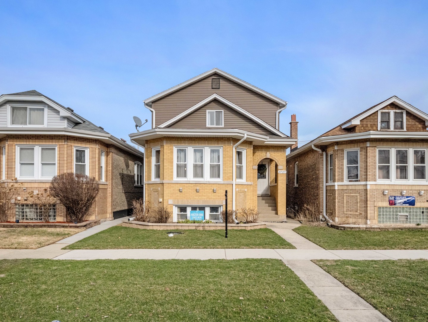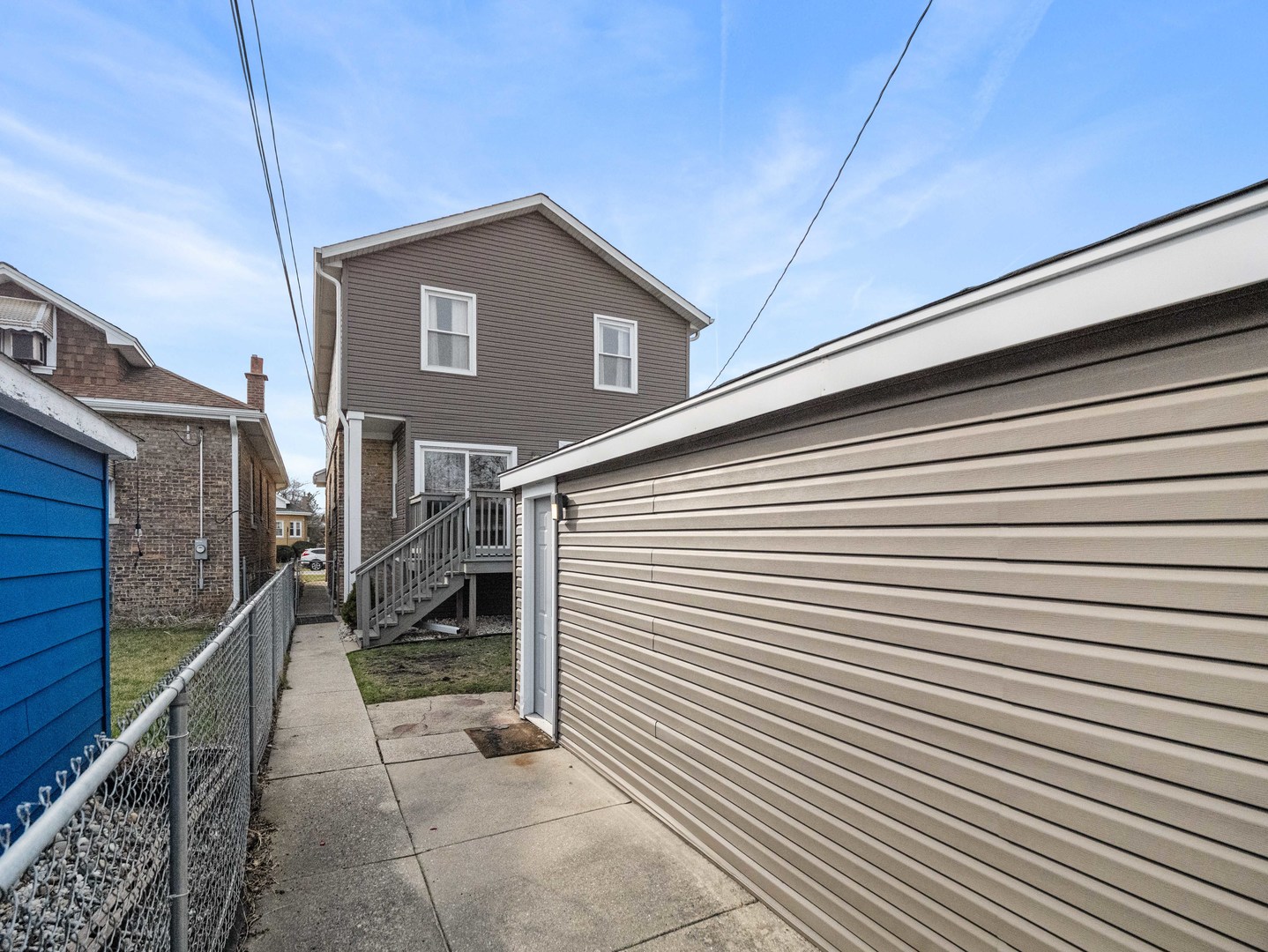 Fully renovated in 2017, this 5-bedroom, 3-bath brick bungalow with a complete 2nd-story addition offers modern living at its finest. This home features a custom kitchen with designer cabinets, newer stainless steel appliances, a granite island, and a glass tile backsplash, all overlooking a serene backyard and deck. Hardwood floors are found throughout the living, dining, and main-floor bedroom, which connects to a whirlpool bath. On the second floor, an expansive primary suite includes a skylight and a large walk-in closet. Two additional extra large bedrooms and a bathroom with double sinks complete this level. The fully finished basement offers a family room, additional bedroom, and ample storage and laundry space with new vinyl plank flooring. Step out back to enjoy a private deck and yard-perfect for entertaining. Just a 15 minute walk from the Metra stop, this well-rounded abode is calling your name. Recent updates include Furnace/AC 2024, New Gutters and Blown in Attic Insulation 2024.