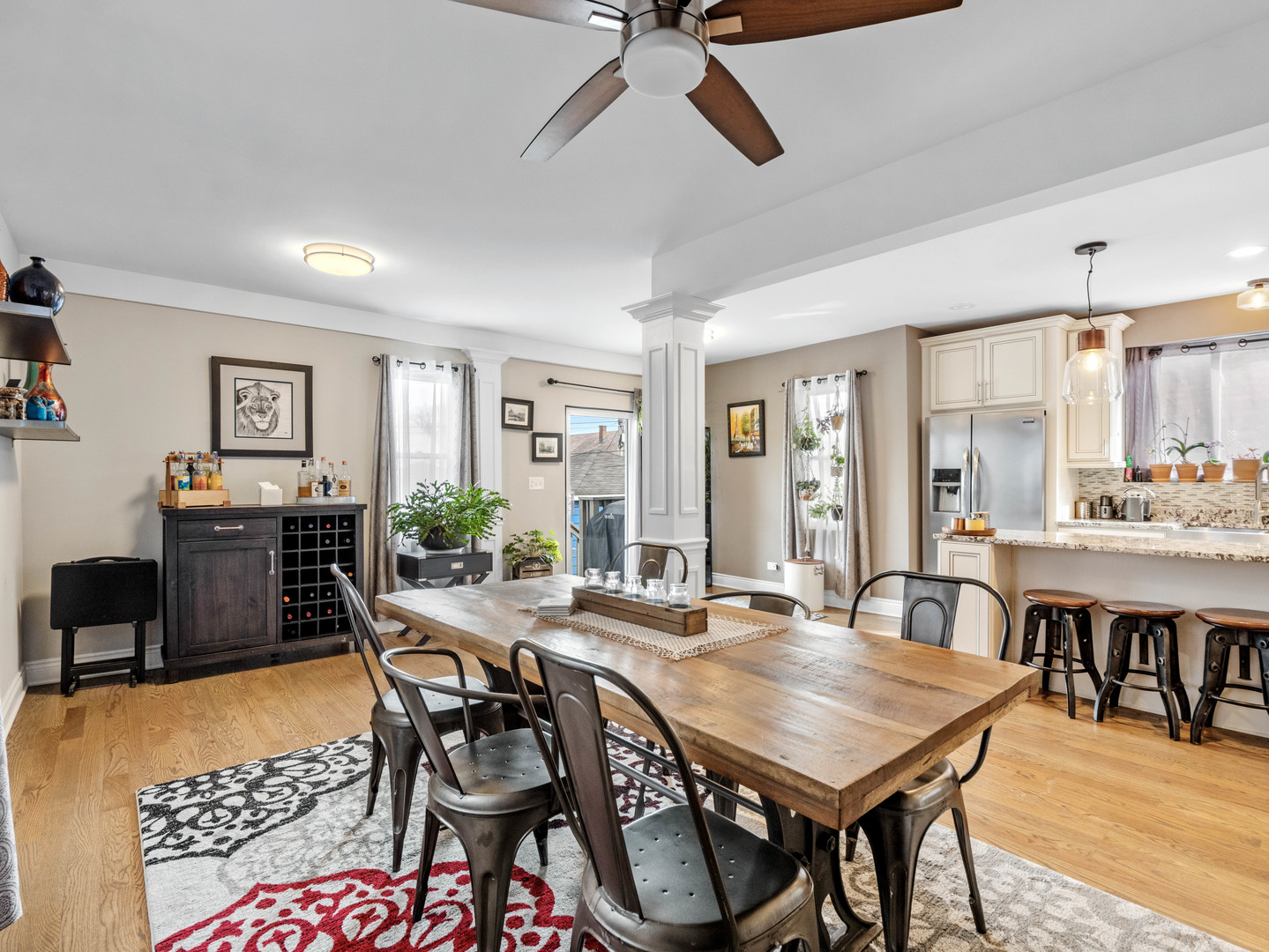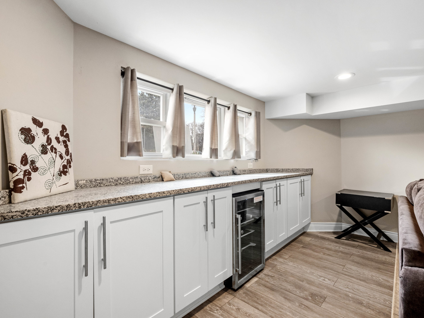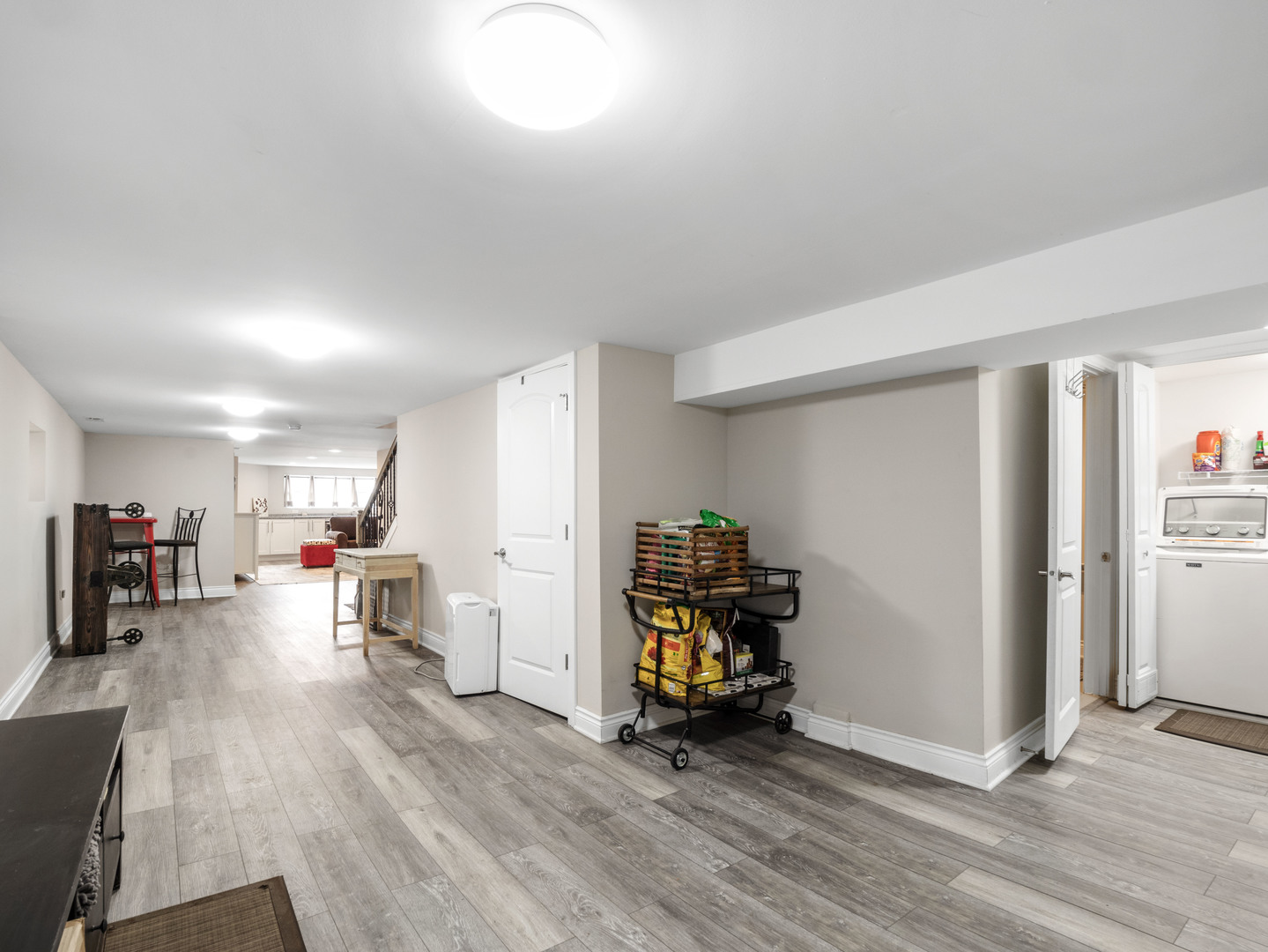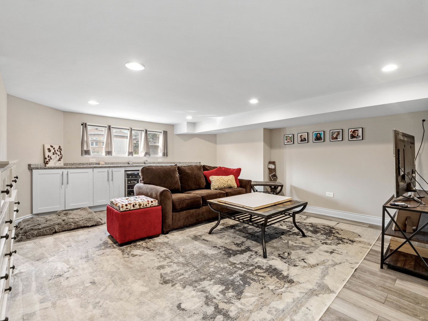 Fully renovated in 2017, this 5-bedroom, 3-bath brick bungalow with a complete 2nd-story addition offers modern living at its finest. This home features a custom kitchen with designer cabinets, newer stainless steel appliances, a granite island, and a glass tile backsplash, all overlooking a serene backyard and deck. Hardwood floors are found throughout the living, dining, and main-floor bedroom, which connects to a whirlpool bath. On the second floor, an expansive primary suite includes a skylight and a large walk-in closet. Two additional extra large bedrooms and a bathroom with double sinks complete this level. The fully finished basement offers a family room, additional bedroom, and ample storage and laundry space with new vinyl plank flooring. Step out back to enjoy a private deck and yard-perfect for entertaining. Just a 15 minute walk from the Metra stop, this well-rounded abode is calling your name. Recent updates include Furnace/AC 2024, New Gutters and Blown in Attic Insulation 2024.
