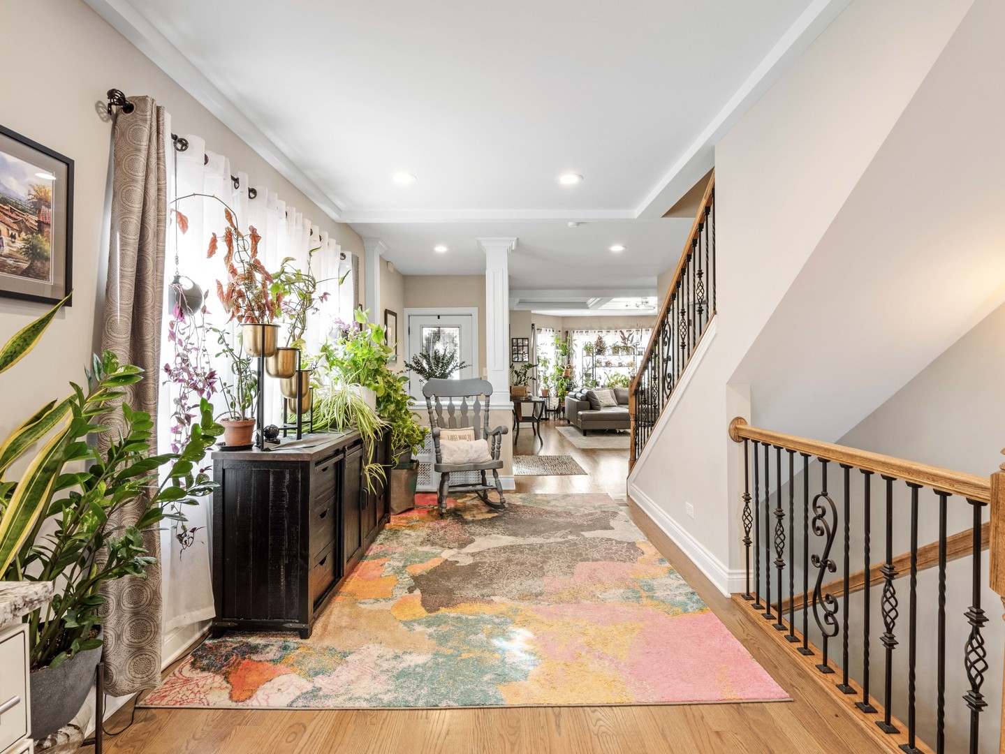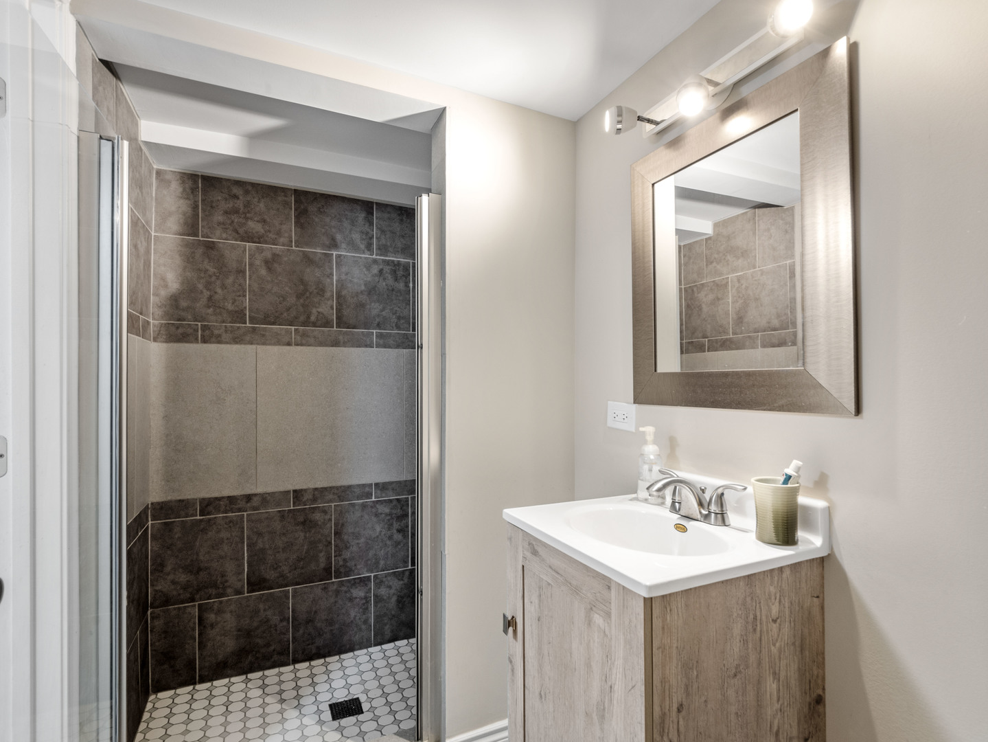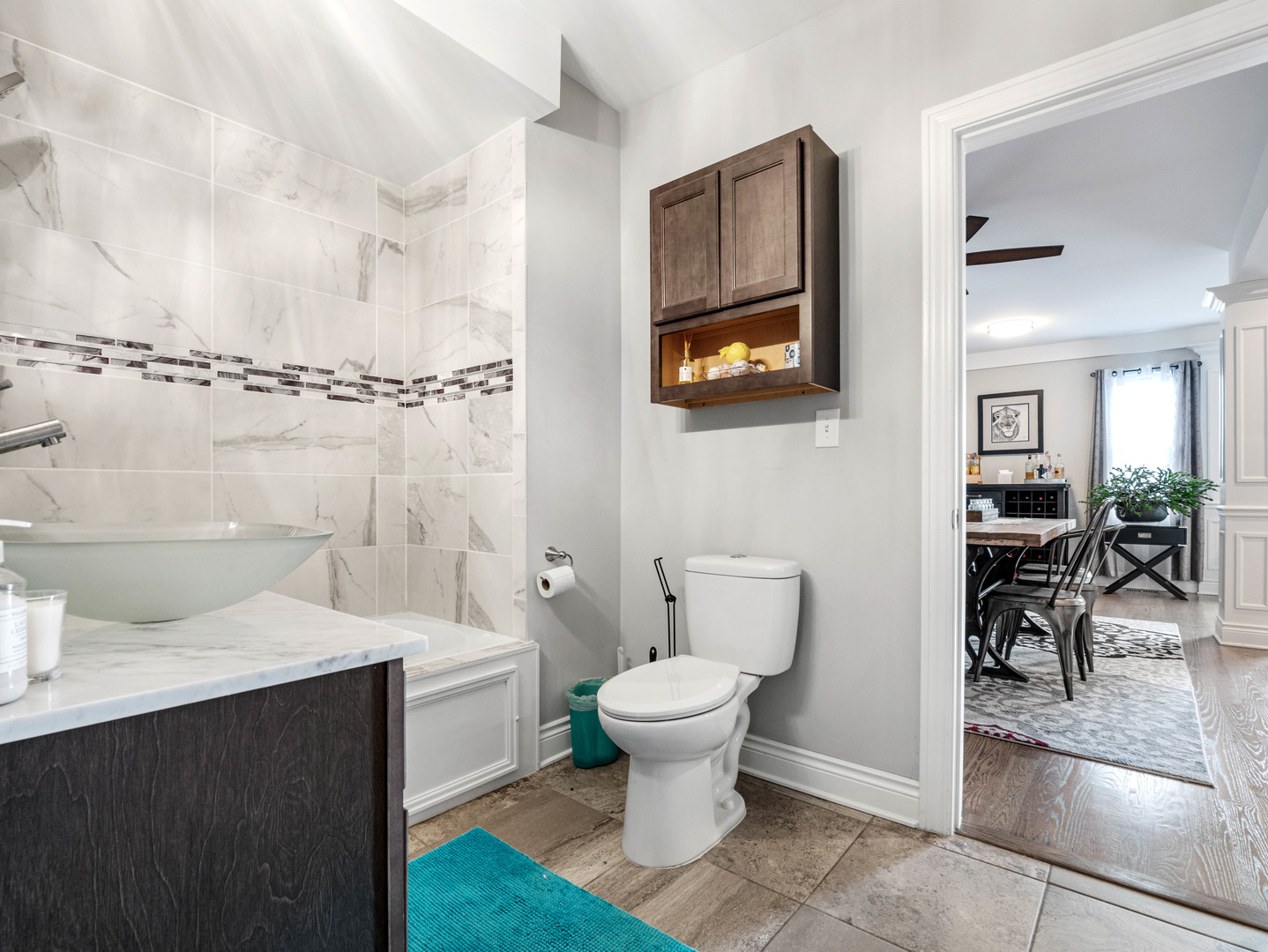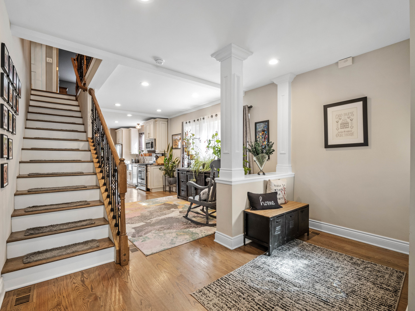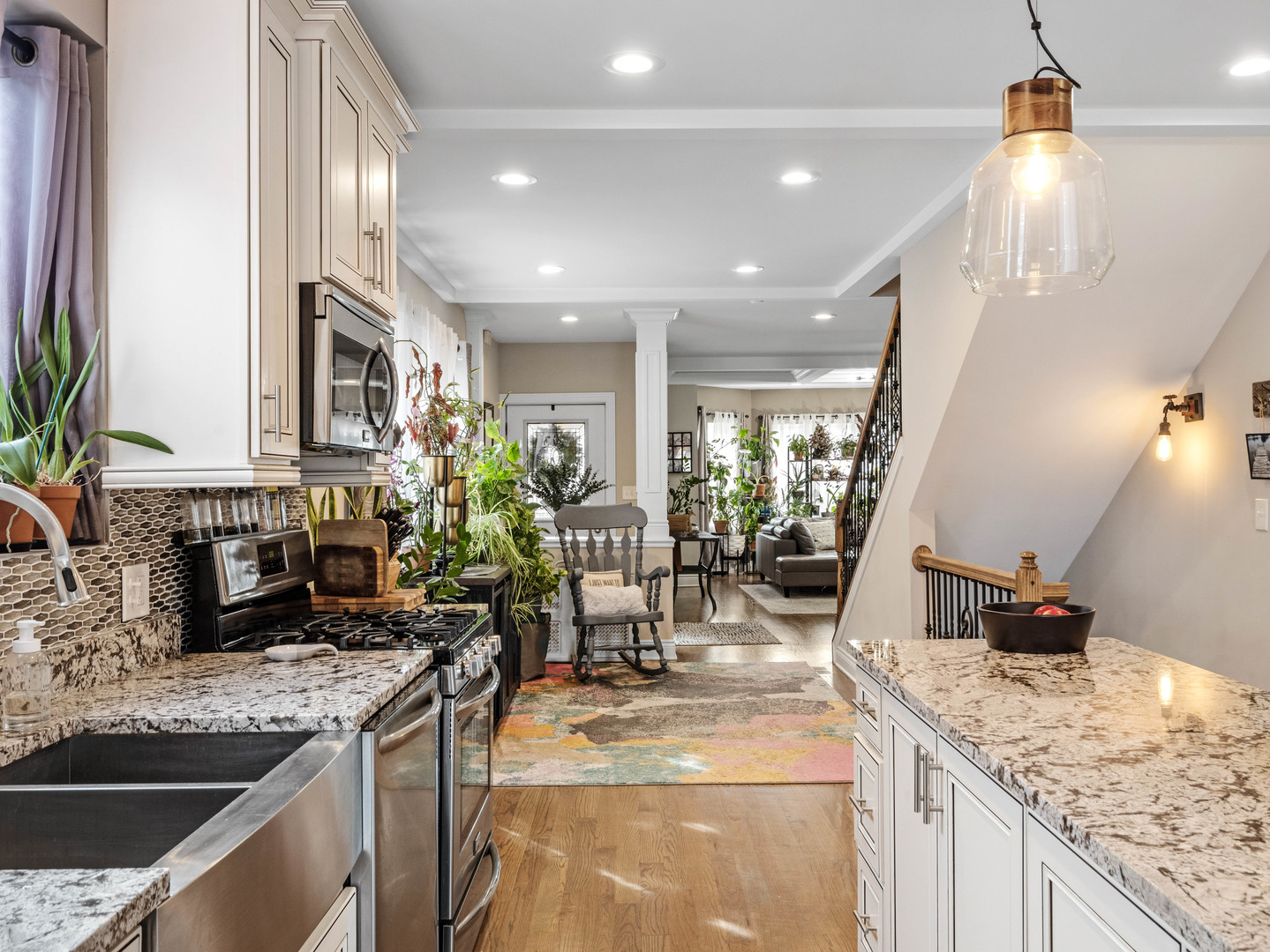 Fully renovated in 2017, this 5-bedroom, 3-bath brick bungalow with a complete 2nd-story addition offers modern living at its finest. This home features a custom kitchen with designer cabinets, newer stainless steel appliances, a granite island, and a glass tile backsplash, all overlooking a serene backyard and deck. Hardwood floors are found throughout the living, dining, and main-floor bedroom, which connects to a whirlpool bath. On the second floor, an expansive primary suite includes a skylight and a large walk-in closet. Two additional extra large bedrooms and a bathroom with double sinks complete this level. The fully finished basement offers a family room, additional bedroom, and ample storage and laundry space with new vinyl plank flooring. Step out back to enjoy a private deck and yard-perfect for entertaining. Just a 15 minute walk from the Metra stop, this well-rounded abode is calling your name. Recent updates include Furnace/AC 2024, New Gutters and Blown in Attic Insulation 2024.