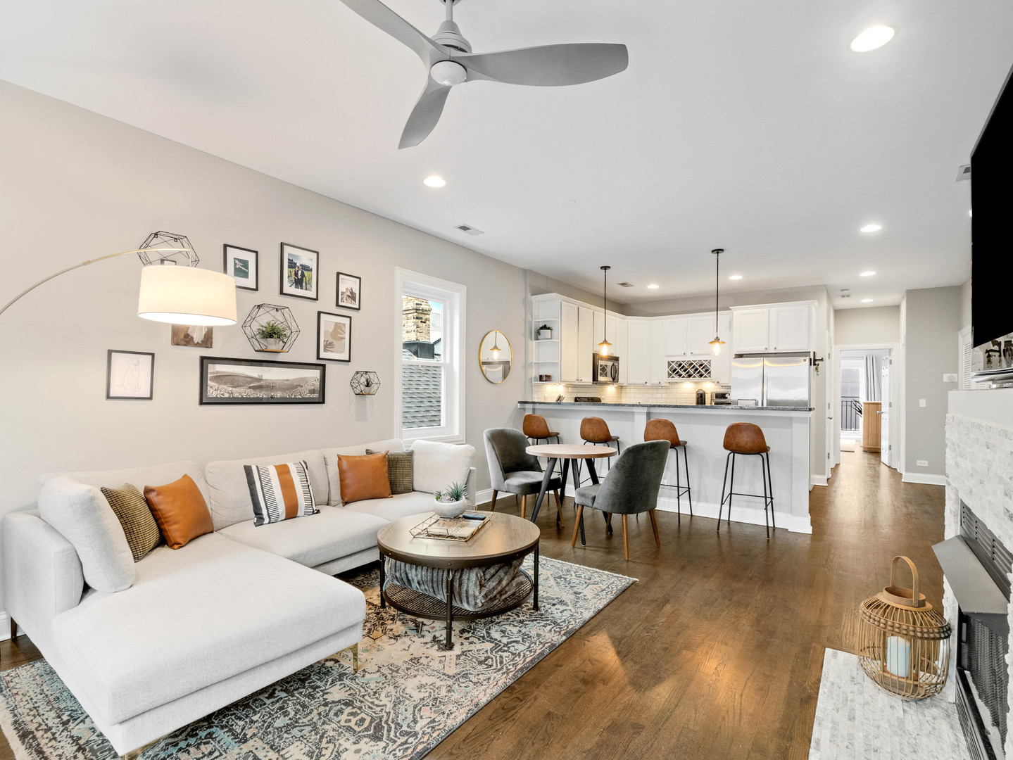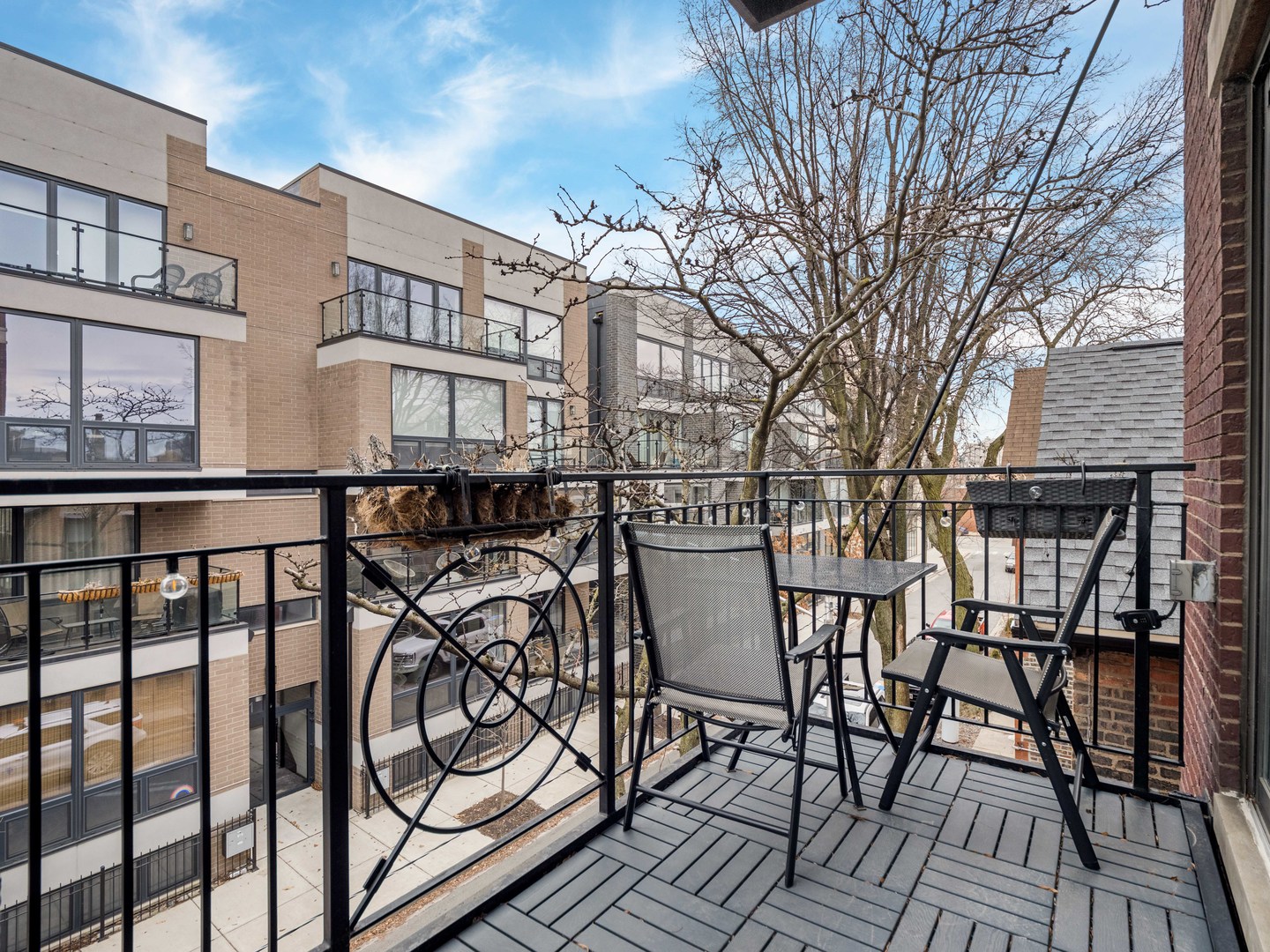 Don't miss this bright and spacious 2-bedroom, 2-bathroom condo in the heart of Ukrainian Village with east, south, and west exposures. The open-concept living, dining, and kitchen area features white cabinetry, granite countertops with a breakfast bar, a pantry, and stainless steel appliances. Enjoy fresh air and treelined views from the private balcony off the living room. The primary suite boasts a walk-in closet and a luxurious en-suite bath with a jacuzzi tub, double vanity, and granite countertops, which are also found in the second bathroom. Additional highlights include beautiful new hardwood floors, fresh paint, custom window treatments, a gas fireplace with refreshed tile surround, in-unit laundry, built-in speaker wiring, and outdoor parking included.