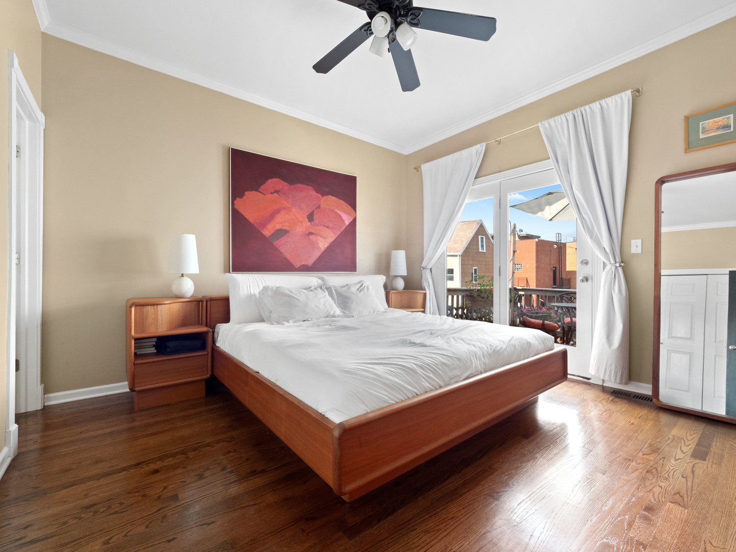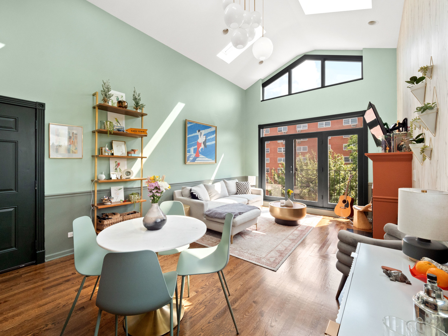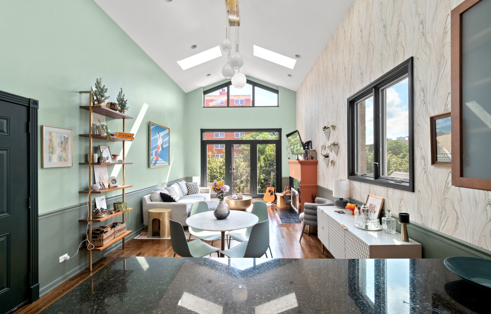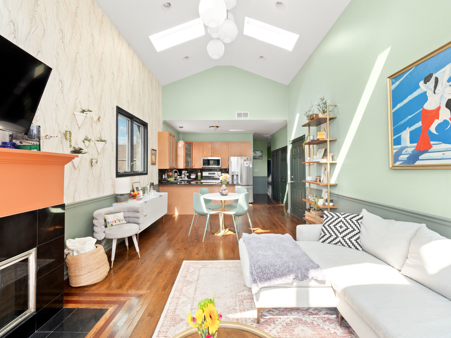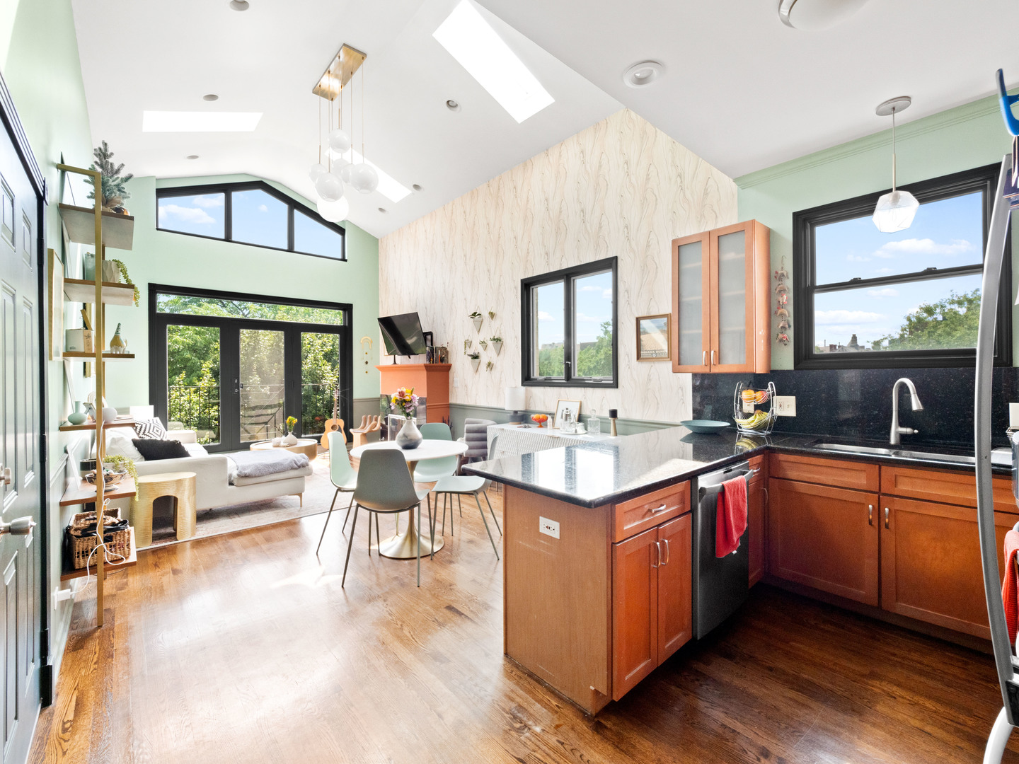 Welcome to this inviting 2-bedroom, 2-bathroom residence at 838 North Greenview Avenue. Situated on the top floor, this home boasts a stunning natural light with eastern/southern/western exposure, and even some city views. The interior offers hardwood floors, vaulted ceilings with skylights, and a cozy wood-burning fireplace creating a warm and inviting ambiance. The kitchen features new stainless steel appliances and granite countertops with great prep space for culinary enthusiasts. Enjoy the convenience of in-unit laundry, central A/C, and garage parking. Step outside to your own generously sized private deck for a tranquil space to unwind. Additional amenities include a common outdoor space off of the garage. This home is in a fabulous Noble Square location, with numerous restaurants and coffeeshops nearby alongside easy access to public transit (blue line/buses) and the expressway. Don't miss the opportunity to experience low-rise luxury living with this chic urban retreat!